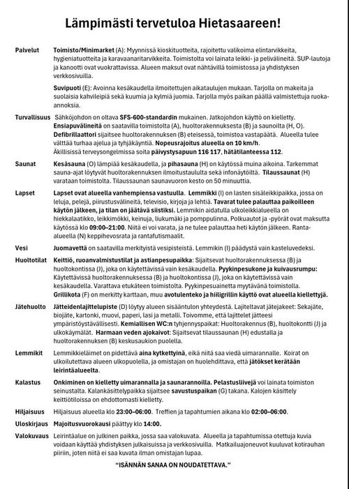 Tultuasi alueelle, täytä matkustajailmoitus. Löydät lomakkeen huoltorakennuksen eteisestä. Lisäksi sieltä löydät muut ohjeet, alueinfon ja -kartan sekä pankkisiirto- lomakkeet ohjeineen sekä hinnaston. Vaunu-/autopaikan voit valita noudattaen turvavälejä.